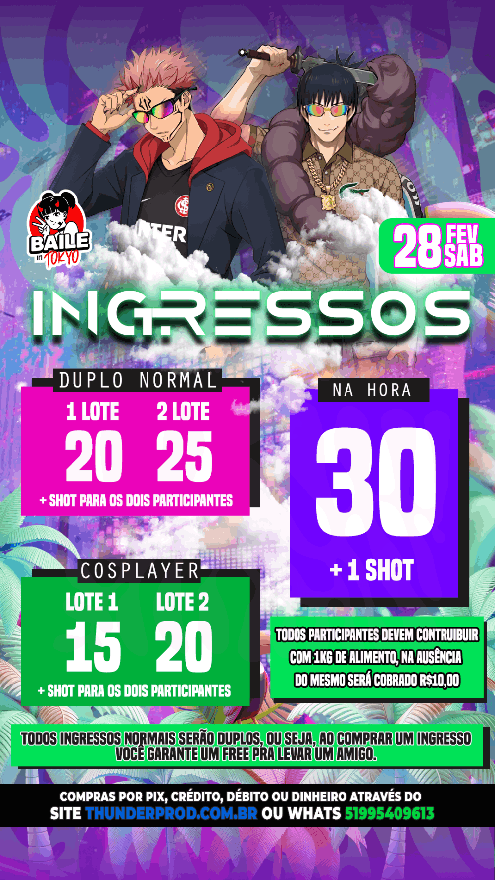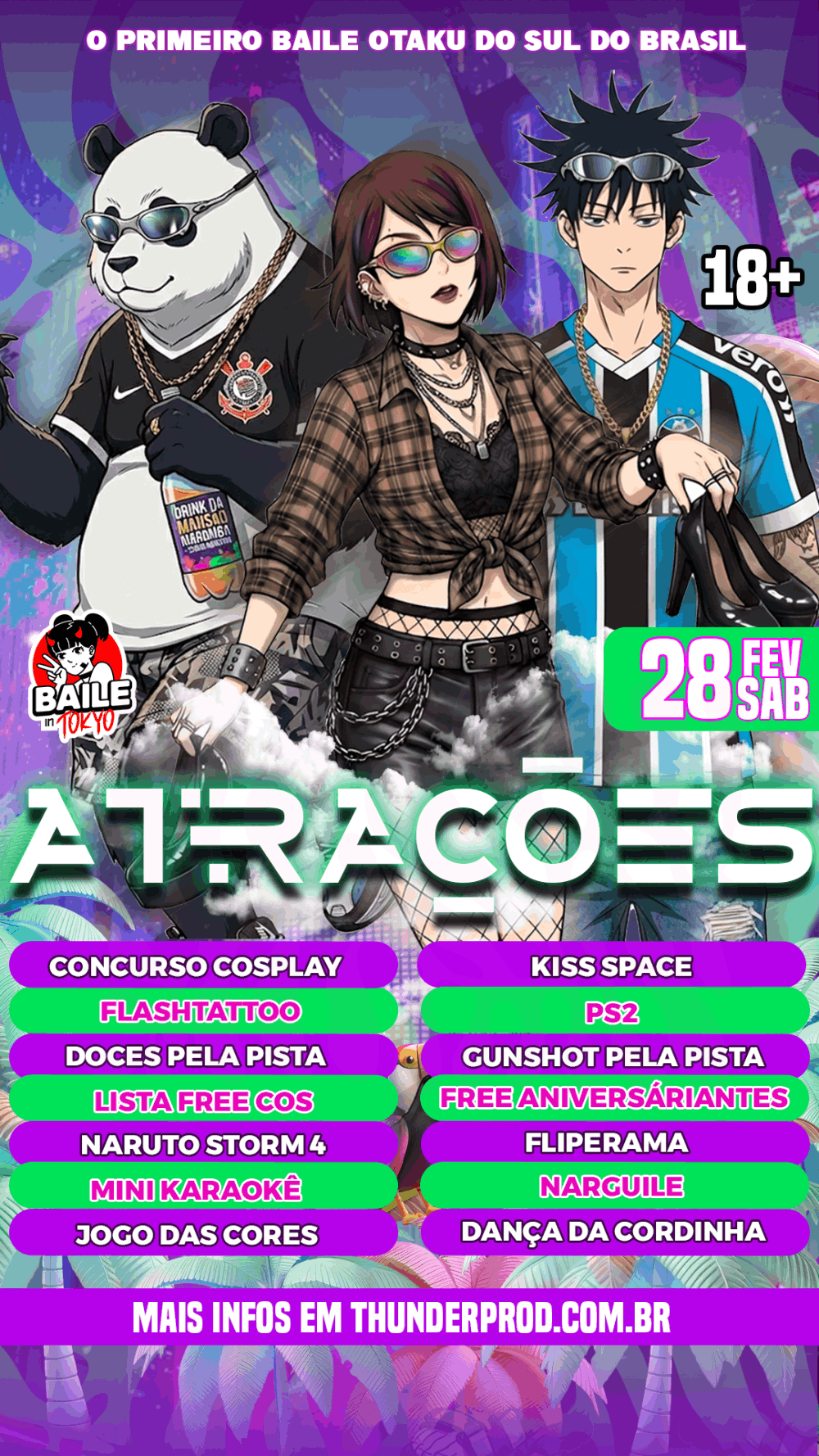 Nossa missão é reunir todos os feiticeiros jujutsu, caçadores de demônios e a elite otaku de POA para o fluxo mais épico do ano! Dizem que até o Pochita já garantiu o chapeuzinho de aniversário e o pessoal da Toman foi visto descendo a João Inpácio atrás do KISS SPACE COM DOCES. 🍭✨